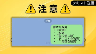 書式 操作方法 入力例 太字 単語やメッセージの前後に半角または全角スペース+半角アスタリスク[*]を入力 *明日の夜、* 誕生日パーティーしない? 斜体 単語やメッセージの前後に半角または全角スペース+半角アンダーバー[_]を入力 _いいね!_